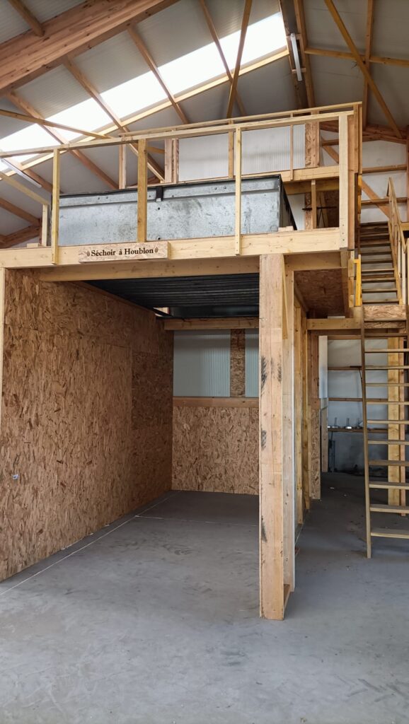 This summer, with my brother, We’ve helped my uncle who create a hop farm there is 3 years to build him hop dryer. We built a part of the structure whith 20 centimeter wooden post. Next, we put isolation and OBS panel on the structure. Then, we create a stockage cell whith allow to empty the dryer. We also built stairs and platforms to walk throught the hop dryer.